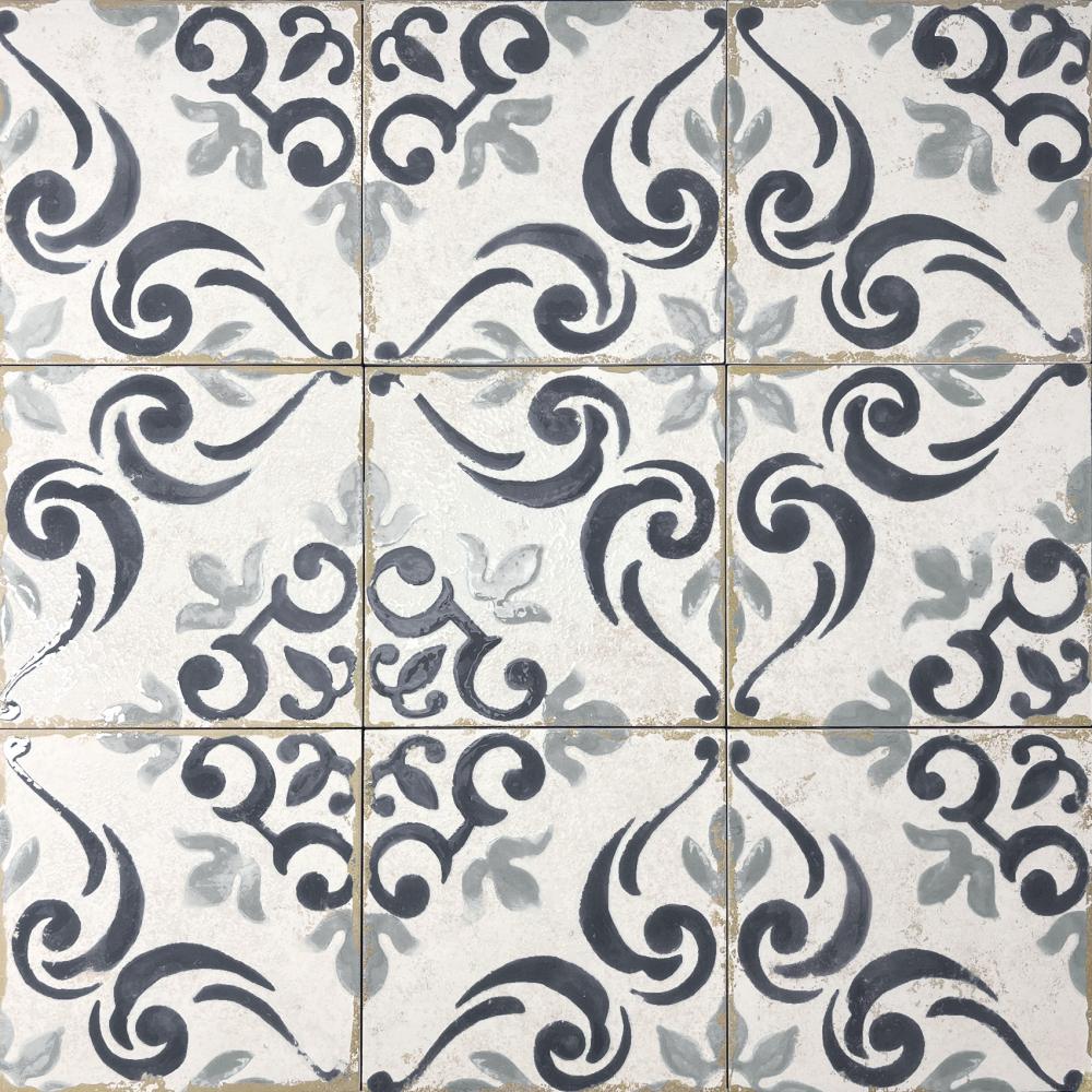Magnifique carreau en grès cérame au format 20x20 cm qui réinterprète avec délicatesse les motifs hydrauliques valenciens, avec des dessins végétaux et curvilignes pouvant être utilisés seuls ou combinés avec les autres décors de la série. Cette pièce se distingue par ses coups de pinceau dans un ton gris profond, sobre et élégant, et par sa finition vitrée, qui apporte du relief et de la profondeur, accentuant sa valeur esthétique et offrant une sensation de sophistication artisanale.