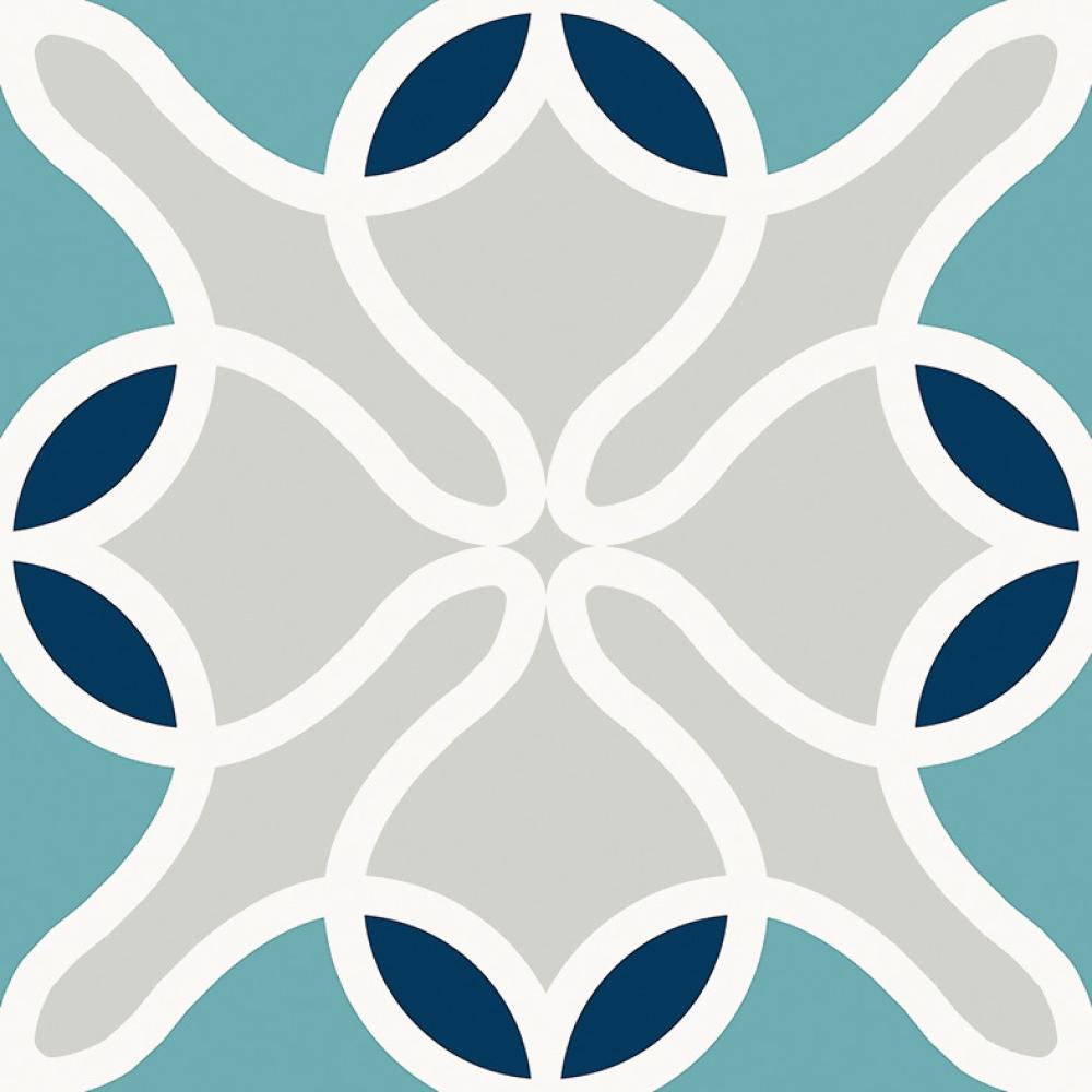 Le carrelage moderne de type carreau de ciment 20x20 cm Corfu, avec un imprimé classique remis au goût du jour dans les tons aigue-marine, bleu marine, gris et blanc.