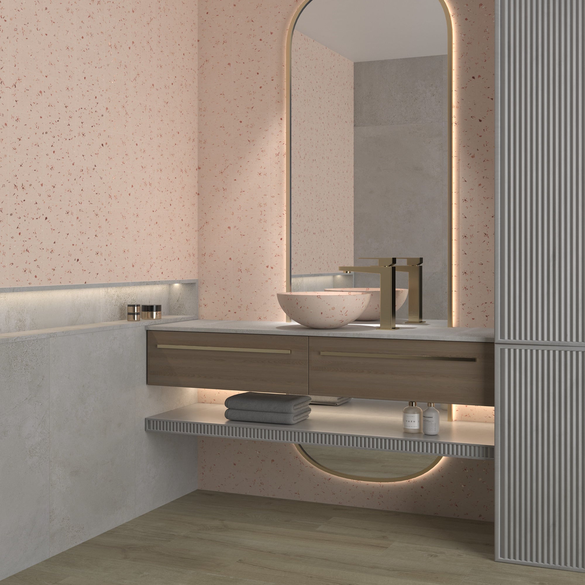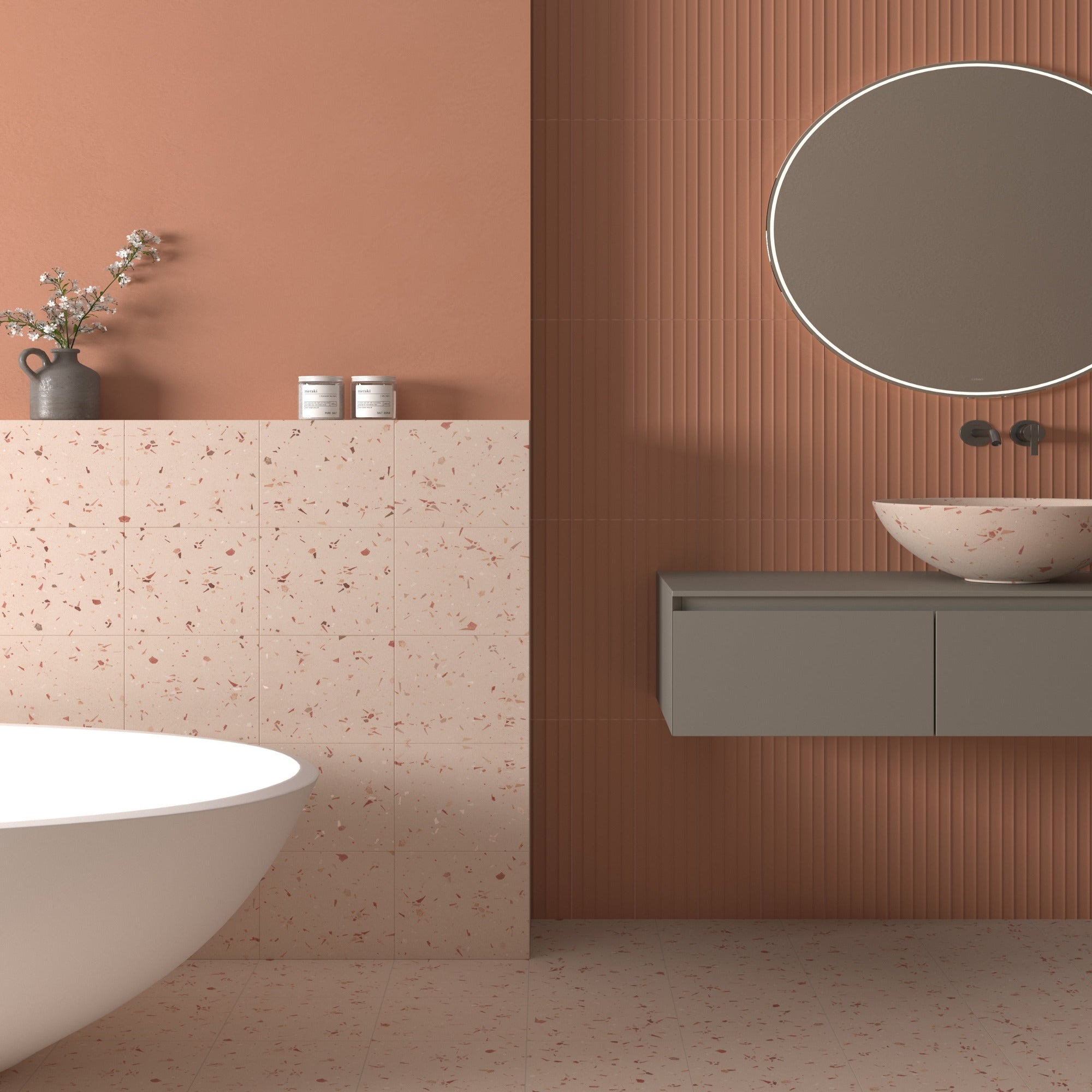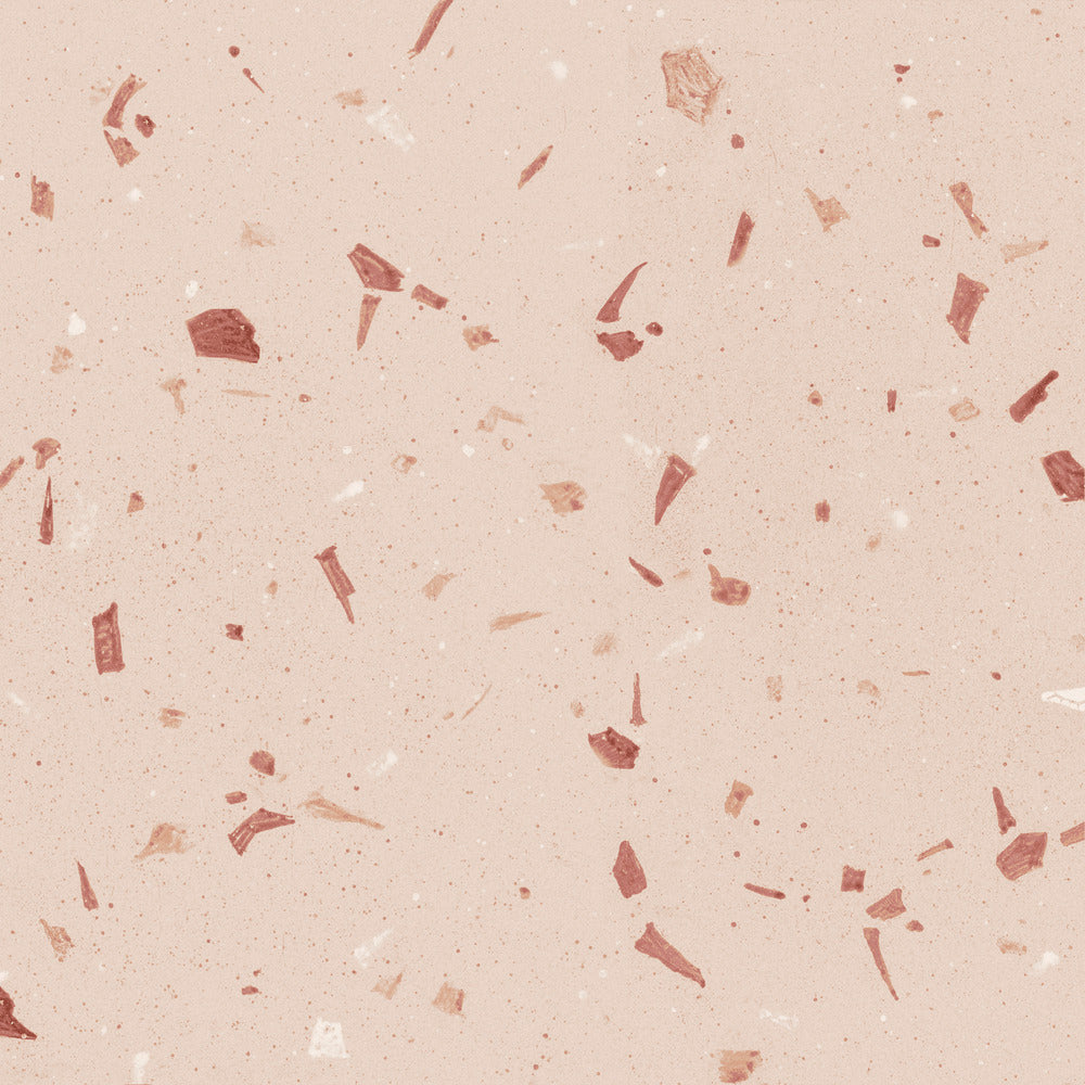 Ce carreau en grès cérame au format 20x20 cm qui réinterprète le terrazzo avec une approche artistique. Sa teinte corail se distingue par sa tonalité joyeuse et délicate, sur un fond poudré où flottent des fragments rougeâtres appliqués à la main et de petites paillettes scintillantes. Sa finition soft&safe offre un toucher agréable et le rend sûr pour une utilisation au sol, même dans les pièces humides.
