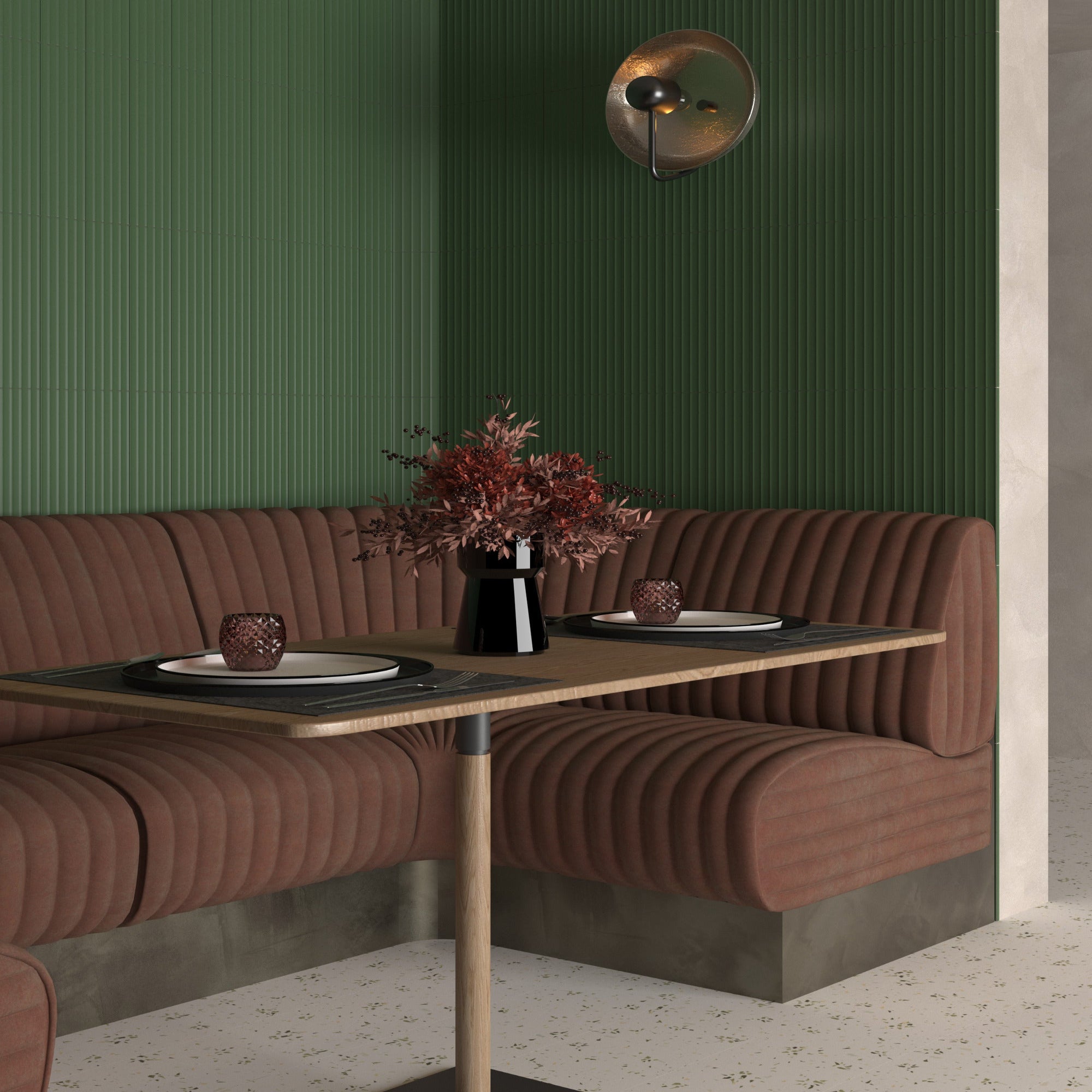 La série est complétée par des lavabos en céramique peints à la main dans les mêmes couleurs, et par le relief IMA de 10x40 cm, une pièce monochrome à la surface rainurée qui apporte texture, rythme et continuité esthétique.