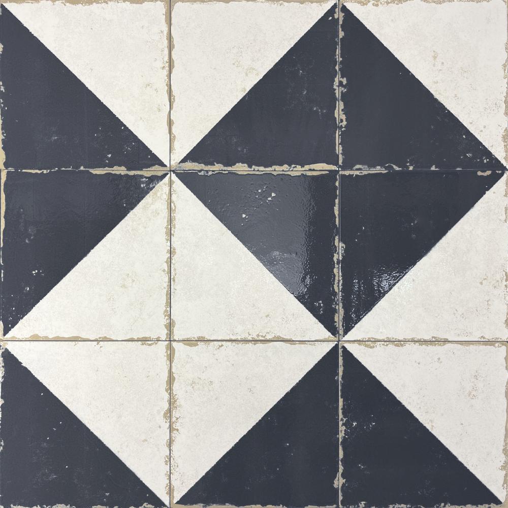 Le carreau Cabanyal Marengo en porcelaine de 20x20 cm qui actualise le "mocaoret" valencien historique avec une élégante teinte marengo, idéal pour des environnements sobres avec une touche de design traditionnel. Son format diagonal, alternant le blanc avec un gris profond, permet de multiples possibilités de pose qui invitent à jouer avec la géométrie et à créer des compositions personnalisées.
