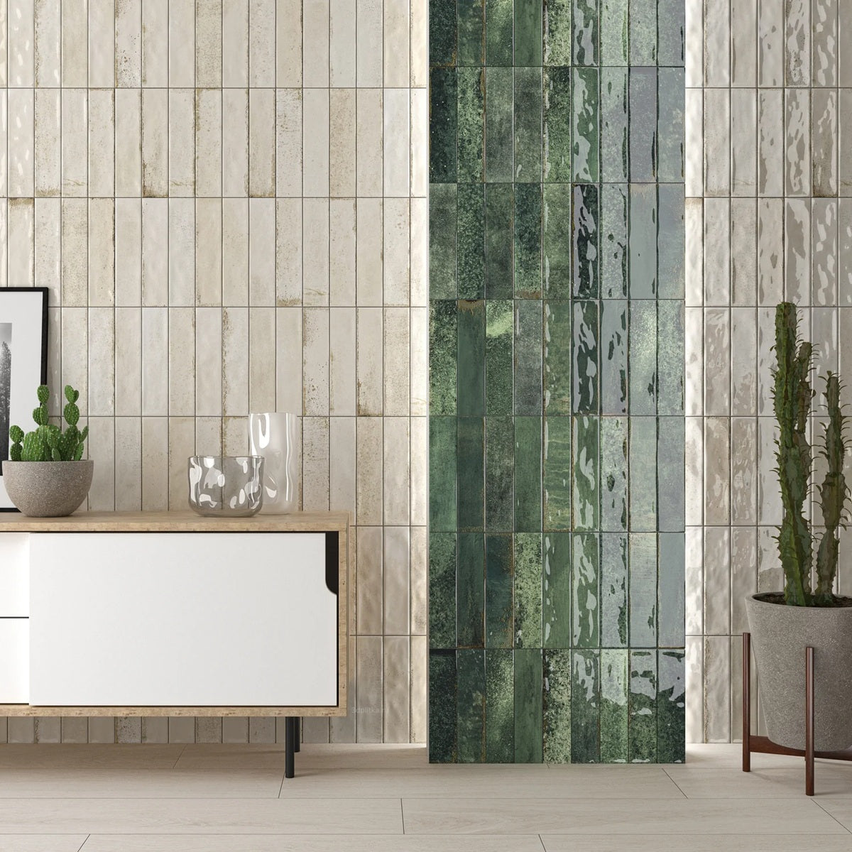 La collection Asly, avec sa finition brillante et son effet zellige, capture l'essence de la céramique artisanale. Disponible en vert, ce carrelage rectangulaire crée une ambiance chaleureuse grâce à ses variations de motifs et nuances subtiles. Idéal pour des murs décoratifs élégants et authentiques.